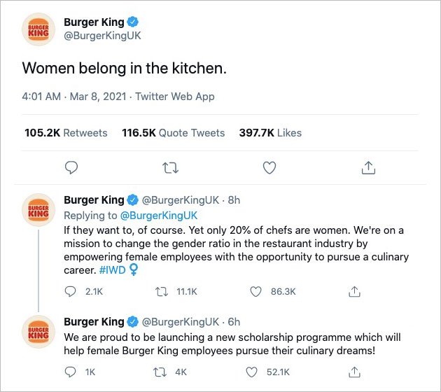 Burger King’s International Women’s Day tweet from 2021 missed the mark by a mile and received international backlash from the public. The message was intended to highlight the gender gap in the culinary industry and promote their initiative to support women in the field. However, the use of a sexist and offensive stereotype to grab attention was considered insensitive and tone-deaf. This type of controversial messaging can backfire and create a disconnect between the brand and its target audience, leading to a loss of credibility and trust.