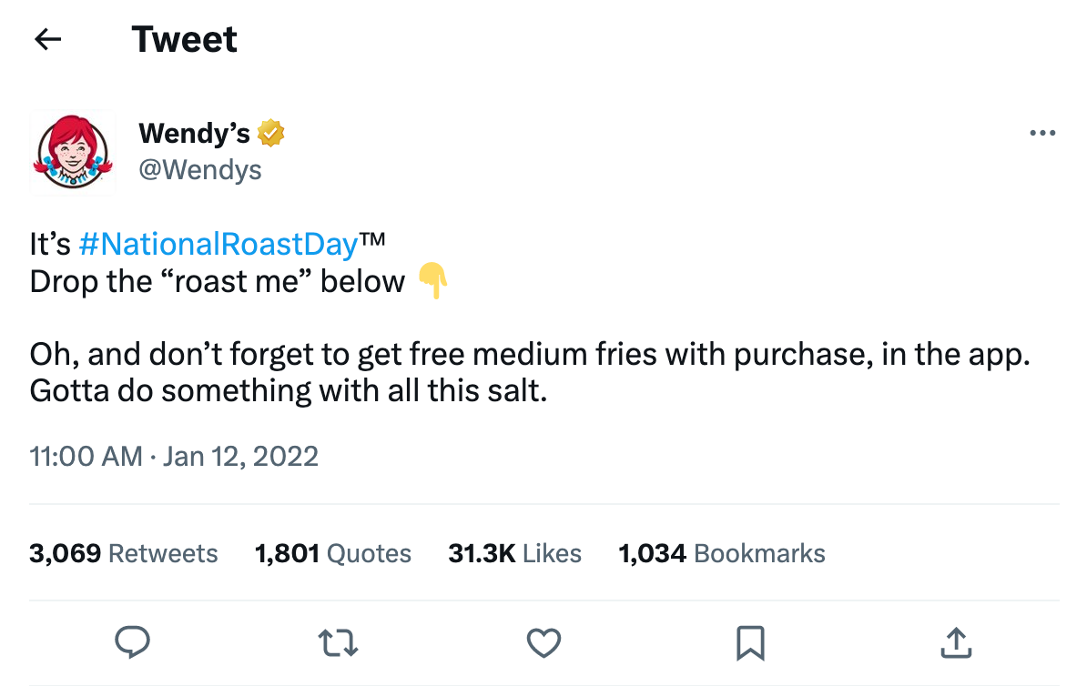 Wendy’s snarky online personality has become a hallmark of its social media presence, which the company has capitalized on with the creation of National Roast Day. This fun and interactive experience increases engagement, drives brand awareness, and further solidifies Wendy’s brand personality.